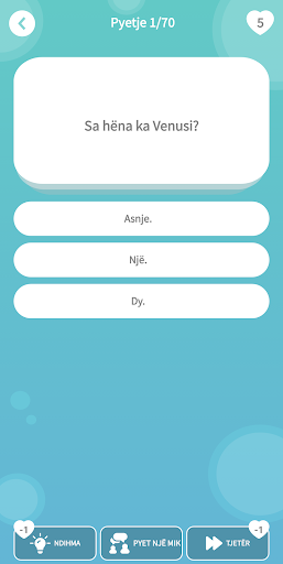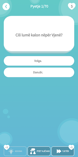 Kuizi i Njohurive të Përgjithshme Shqiptare me pyetje dhe kuizi i njohurive përmban disa pyetje nga kategori të ndryshme kuizash të vogla. Qofshin pyetje të kuizit të gjeografisë, pyetje kuizit të historisë ose pyetje kuizit sportiv, ose pyetje kuizit të kategorive të tjera që ju preferoni - kjo lojë kuizi njohurish përfshin të gjitha kategoritë në një lojë unike kuiz me njohuri të përgjithshme shqiptare. Një gjë është e sigurt: nuk do të mërziteni t'u përgjigjeni këtyre 70 pyetjeve të shpejta. Disa mund t'i kenë të lehta këto lojëra kuiz me njohuri të përgjithshme, ndërsa të tjerëve mund t'i kenë të vështira, por patjetër do t'ia kaloni mirë me aplikacionin Albanian General Knowledge Quiz.