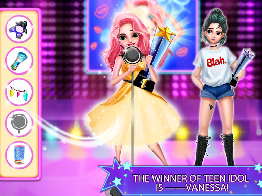 One day, she got magical powers and she can turn into a beautiful 16-year-old girl Vanessa as her wish. She ran into a talent scout and joined TEEN IDOL’s competition.