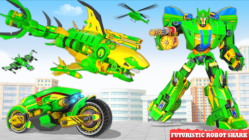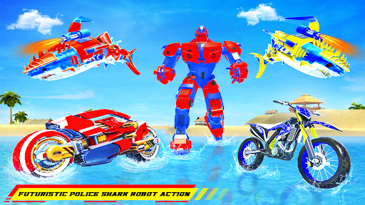 Action in this transform robot game includes driving real moto bike, advanced robot wars game quests, flying shark attack with grand robot weapons and rescue modern city from shooting robot mech warrior.