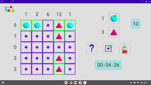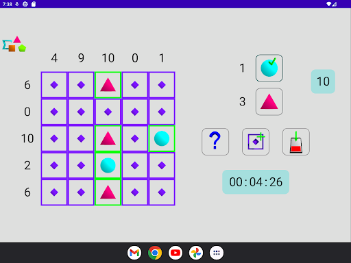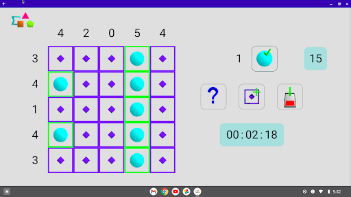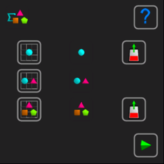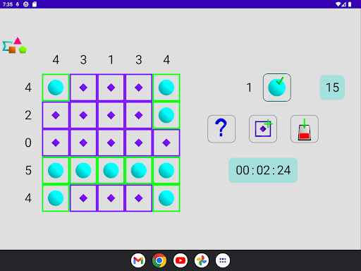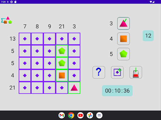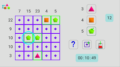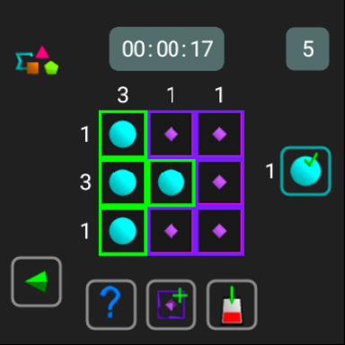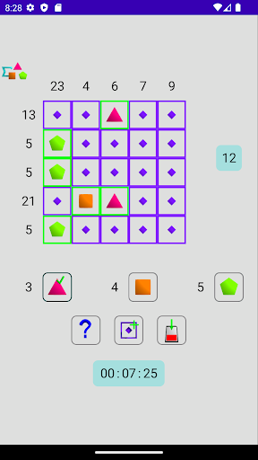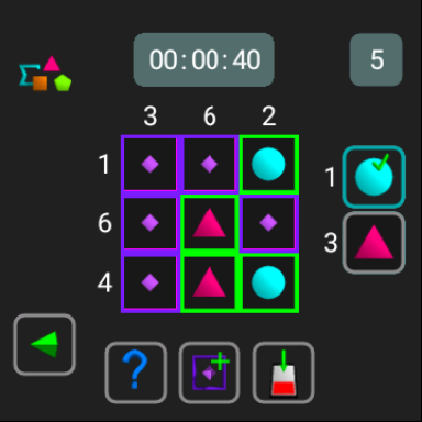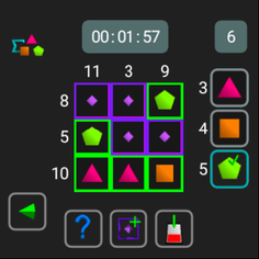 - difficult: a cell can be empty or have value 3 (triangle), 4 (square) or 5 (pentagon)