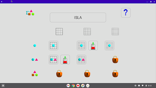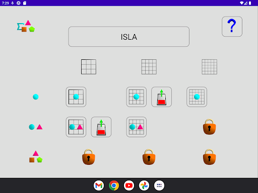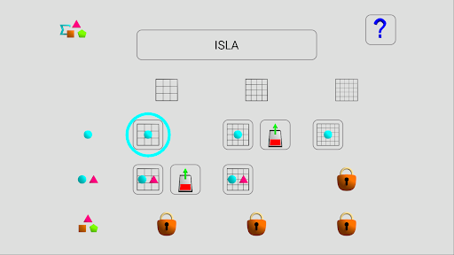 During a round it is initially proposed a grid having only one form to find, then two, up to number of cases. In case of error it is necessary to start again the same level (same number of forms to be found). Each grid proposed is chosen by chance but has always only one solution.