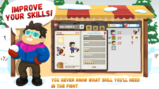 In this game, players can choose from four different protagonists, each possessing a unique bonus that enhances their abilities. Jack has the Health bonus, which makes him an ideal team leader, as he falls sick less often than other snowicks because of his childhood love for jam. Tommy, the youngest and most enthusiastic member of the team, receives the Speed bonus, which allows him to move faster than anyone else. Stan, who is the strongest and most durable snowick, receives two bonuses: the Power Bonus that amplifies the damage caused by his snowballs and the Endurance Bonus that slowly consumes his energy. Cindy, the only girl in the team, receives the Accuracy Bonus, making her an expert at hitting her targets with her deadly snow blower.