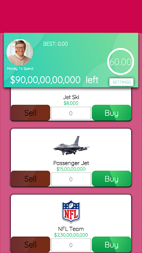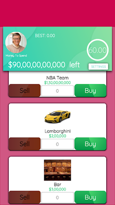 This money spending game is inspired by spend bill gates money Neal, with high-quality graphics, and amazing functionalities. It’s a fun simple idle game where you have to spend all bill gates money. You'll be given 60 seconds to spend all the money. Take a break from your work and enjoy buying various items in this spend money app.