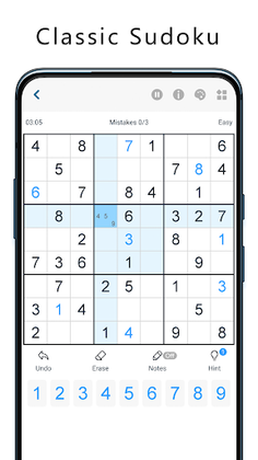 The rules of the Classic Sudoku puzzle game are very simple. The goal is to put 1 to 9 numbers into each grid cell so that each number can only appear once in each row, column, and block. Even a beginner can master the sudoku free puzzle game in a very short time.