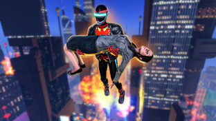Super hero flies high up to the sky so no-one can escape even with a cobra helicopter