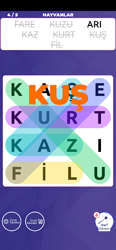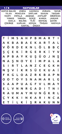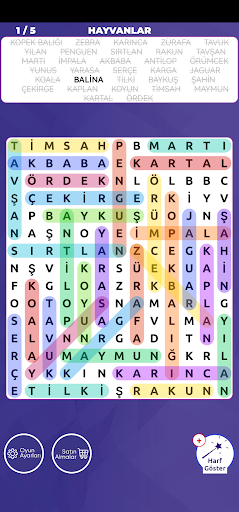 Hint will be your helper in difficult times. You can use the Show Letters hint when the clipboard is getting cluttered and you have trouble finding words. When you use this feature, the starting point, that is, the first letter, of one of the words given to you will be displayed. Let us give you one more tip. When you say show letter, a clue about the first word you can't find from the given words will be shown. With tens of word hints, you will be able to find all the words more easily.