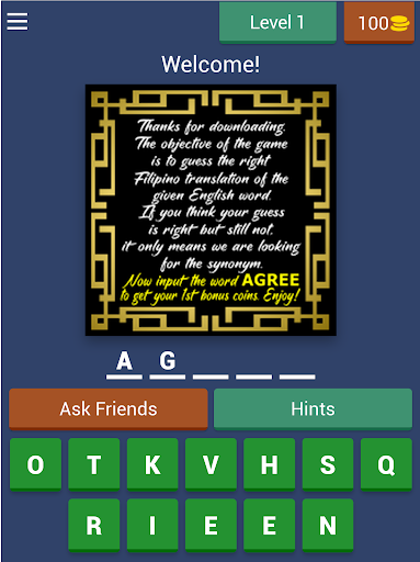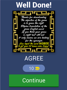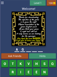 The objective of the game is to input the right Filipino/Tagalog translation by selecting the correct letters. The game starts in easy mode, but as you progress through levels, the answers become more challenging. It's a great opportunity for foreigners and tourists who want to learn the Filipino/Tagalog language.