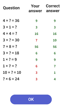 After each training, you have the opportunity to see which questions have been answered correctly and which have not. This will help next time to improve the result and remember your times tables at home in an easy, step-by-step way.