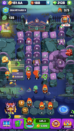 Tomb Miner - Idle Merge features unique merge game mechanics, allowing you to merge minions to create an idle army, build tombs and to collect gold even when you're offline.