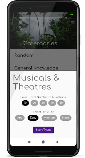 ◘ Each time the trivia questions are generated randomly. So no two question sets are same even with same set of values chosen by the user.