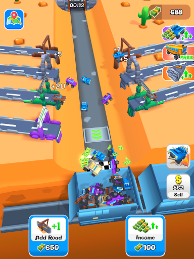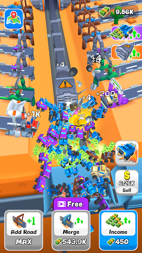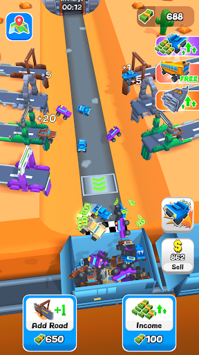 Your goal is to manage a fleet of trucks that travel along conveyor belts, delivering goods to the end of the line where they are collected and sold for profit. As you progress, you can merge three identical conveyor belts to create more advanced and profitable routes.