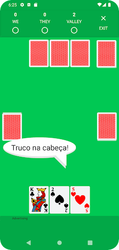 You can play with 2, 4, 6, 8, 10 or 12 people, always divided into two teams. In modalities of 6 to 12 people, the odd rounds are played in teams and the even rounds are played individually, only the players facing each other (the so-called forehead games). In this case, individual points count for the team as a whole. There is still a last modality, with three people, where the players take turns, forming pairs against a single player, the carancho. In this case, the points are counted individually (but the duo earns the points together). The carancho always receives the first card and an extra card. Of these, you can choose the three best and discard one; then the game proceeds normally.
