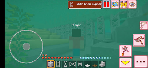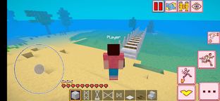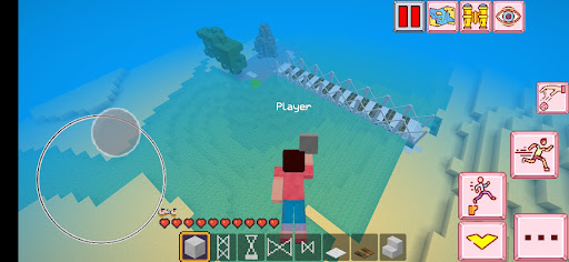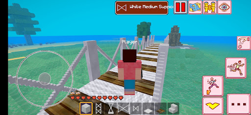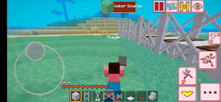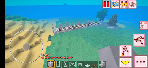 Place the base of the bridge on the ground in sea water, then build the pillars by arranging uniform blocks to support the bridge, then make a road over the bridge using steel and wood. Be careful when placing the base of the bridge, because the laying activity will reduce your breath, because you are in the water this will be seen on the hudbar. And you will look tired and your energy will decrease, so do the following, take the food in the inventory, you can eat apples, corn, meat by long tapping on the blank screen after your hand holds the food. So that your energy will be refreshed and recharged.