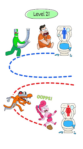 😊 In the WC Rush Race - Maze Run game, you need to help Rainbow, Alphabet and other monsters to find the fastest way to reach the sink. Your mission is so simple, just draw a line to connect the monsters and the bathroom and avoid the characters colliding in the rush race.