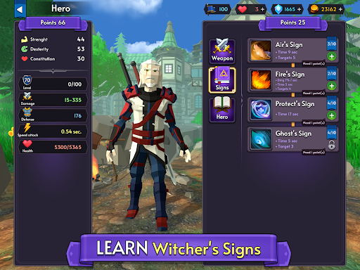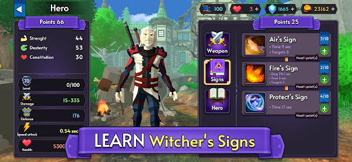 3. Magic signs. Learn the magic of the Witcher to destroy enemies. With each level you will become stronger and upgrade your Hero.