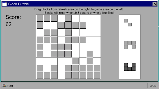 Block puzzle: A classic puzzle game with windows ui style, make blocks match in line or 3x3 squere to clear them, more blocks placed, more score you get.