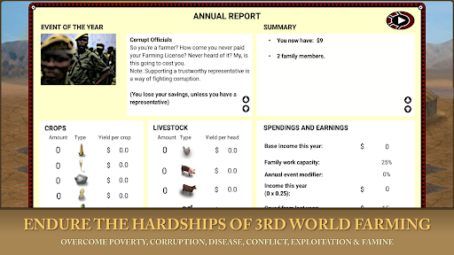 Experience the challenges of farming in a third world country in the thought-provoking simulation game, 3rd World Farmer. As the virtual farmer, you must navigate corrupt officials, unreliable markets, wars, diseases, and droughts that constantly threaten your farm's survival. One bad harvest or unexpected event can have disastrous consequences for your family's economic prospects in the game.