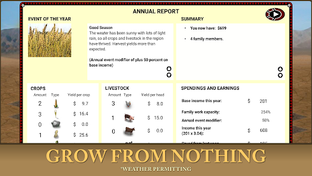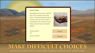 As you manage your virtual farmer family, you must make difficult choices that reflect the reality of life in poorer regions of the world: pay for school fees or have children help in the fields, marry off young adults for a dowry or have them stay and help with the harvest, prioritize spending on medicine, education, or farm investments and decide whether the family can support another child.