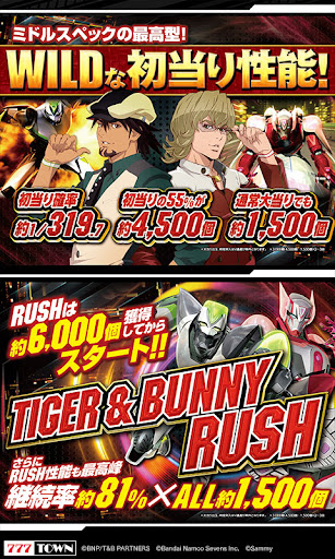 【P TIGER & BUNNY ~完全無欠WILDスペック~】 最強のバディが ぱちんこ初登場! 完全無欠 WILDスペック登場!! ミドルスペックの最高型! WILDな初当たり性能! 初当り確率は約1/319.7 初当りの55%が約4,500個 通常大当りでも約1,500個 さらにRUSH性能も最高峰 RUSHは約6,000個獲得してからスタート! TIGER & BUNNY RUSH 継続率約81%×ALL約1,500個 『P TIGER & BUNNY ~完全無欠WILDスペック~』を思い切り楽しもう! 【豊富な機能】 ■強制フラグ対応強制フラグアイテム等を使用することで、好きなタイミングで好きな小役を投入!アプリならではの夢の展開も可能!?