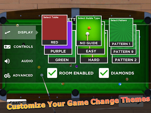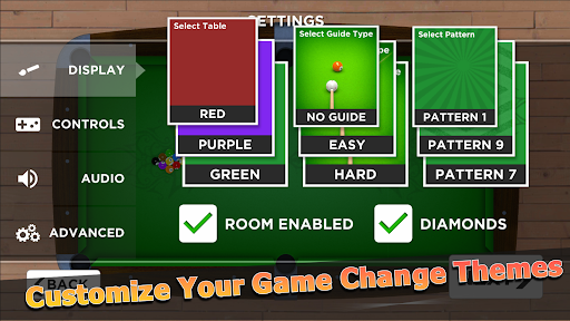 - Customize your pool table by choosing the color and cloth patterns you like.