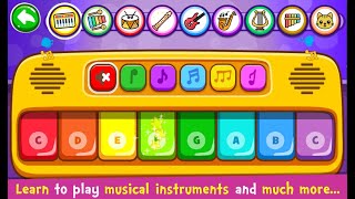 Learn and play musical instruments like toy piano, xylophone, drums, guitar, trumpet, flute and many more.