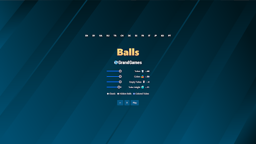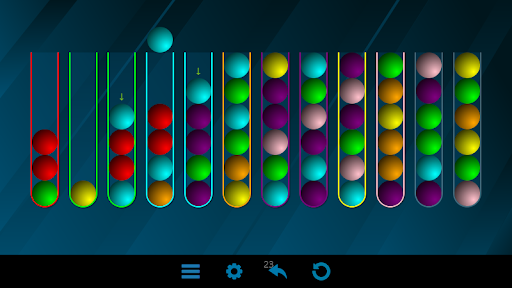 It is necessary to distribute the balls so that in each flask there are balls of only one color. Unlike most games of this genre, you yourself choose the number and height of flasks, the number of colors available, and the game option to your taste. In addition to the classic version, there is a game mode with hidden balls, when balls are darkened in the flasks, the color of which differs from the color of the top ball, as well as the "colored flasks" mode, in which balls must be sorted in flasks of a certain color.