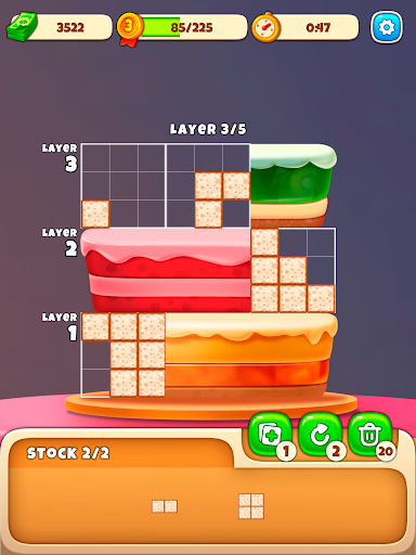Explore a variety of sweet blocks in different shapes that need to be skillfully arranged to fill the entire dessert canvas. Your inventory is brimming with delightful ingredients, and the choice of which one to use next is entirely yours. Once you successfully decorate the entire surface, the blocks will magically transform into the first layer of your exquisite cake!