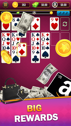 What makes Bounty Solitaire unique from regular Solitaire is the fact that gift cards are hidden among the poker cards in the piles and by uncovering those gift cards you get a chance to win money credits or amazon credits or coins. Every move you make while arranging the cards may trigger an event that allows you to receive money credits or amazon credits or coins. If you feel stuck then you can choose to start over a new game anytime you want without losing the money you've already earned. The best part is that when you finally finish a game of Solitaire you are automatically taken to a spinning wheel that lets you win either tools to make Solitaire playing easier or money credits or amazon credits or coins.