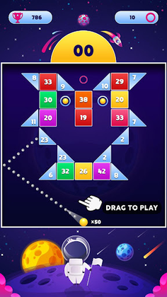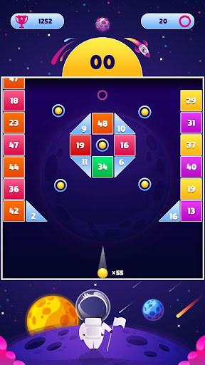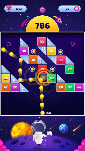 You need to be an expert brick breaker to select the best direction, throw the balls to shoot and demolish the bricks on the brick board. And hit them until the bricks count and durability reduces to zero. Balls bonus will appear in coins in white circles like balls, hit that circle with the ball and the ball count will increase so that you can crush more balls in less time. You need to break and crush all the bricks on the brick board with all the balls before the bricks touch the bottom line. Enjoy crushing bricks with more and more balls as you go further in the space balls game.