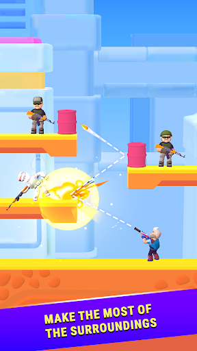 Use main feature of the bullet - ricochet, so that the bullet can hit the target at any point on the level. Use them to destroy various obstacles or use them to destroy squad of mercenaries!