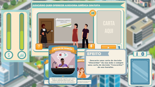 Selecione um dos cinco personagens disponíveis (Prefeita, Vereador, Juiz, Empresário ou Engenheira), cada um com uma habilidade única, e acompanhe o dia a dia nesta cidade, lidando com diferentes tipos de eventos, usando do seu exclusivo deck de cartas para tomar decisões, garantindo que estas metas serão cumpridas.