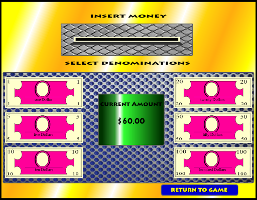 There are 3 different speeds of playing, by clicking the '>' speed arrows. One arrow for slow ('>') and 3 arrows ('>>>') for fast play. Have fun and learn strategies without losing your wallet! Remember, just like the casino, you can't play the game until you insert 'virtual' money into the slot. Just click on the Money Slot to insert money (free credits). Enjoy!