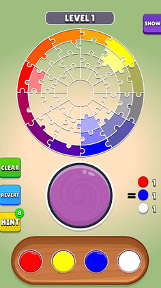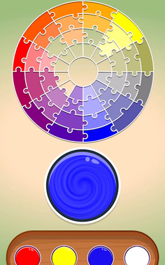 The goal? To match your color mixtures with pieces of a hue puzzle displayed at the top of the screen. In the initial levels, you'll try to create around 60 different shades from the base colors.