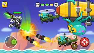 Guide the mecha knights to defend Earth from alien invaders using machine guns, missiles, and laser swords. Victory awaits! (19 words)