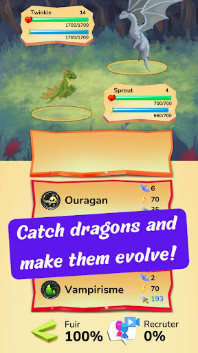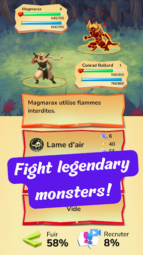 In the forests and mountains hide powerful monsters, face them in epic turn-based battles. Creatures can possess up to 3 spells and possess up to two types among more than 10 (Darkness, Light, Sword, Bow, Stone, Air, …). There are more than 50 spells.