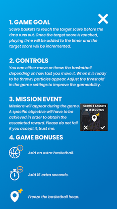 With each new level, the difficulty will increase, you will have to score more baskets in a minimum of time. In addition, the basket will move faster. To reach your goal, game bonuses and special missions will be offered, but beware of the consequences if you fail.
