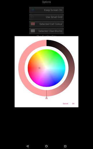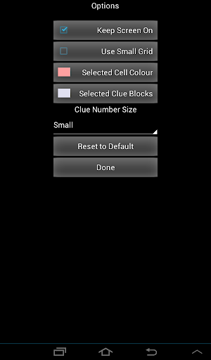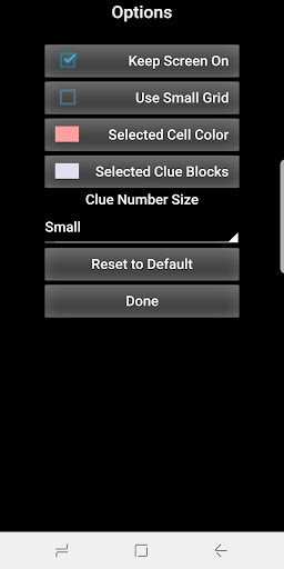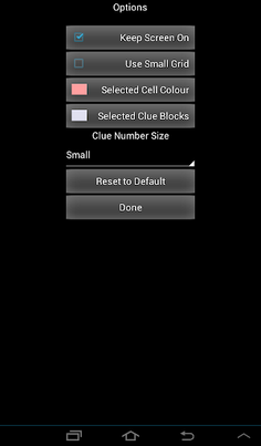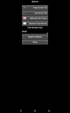 There are also several options you can choose from to customize your gameplay experience. You can keep the screen on, select a smaller puzzle grid to fit on devices with a squarish form factor, and choose different colours for highlighted blocks. Plus, you can adjust the size of the clue numbers if they are hard to read on your device.