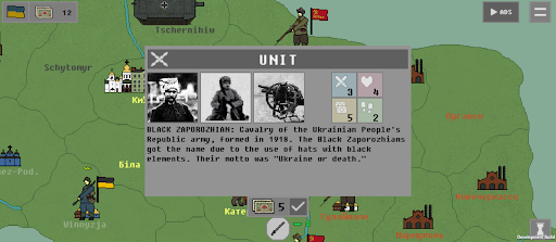 The player can play for the Ukrainian People's Republic, the Crimean Democratic Republic, Poland, the Anarchists, Austria-Hungary, and the German Empire. Each country in the game has its unique set of units with special characteristics (attack power, health, price, and the number of moves on the map per turn), which makes the game for different countries more diverse and interesting.