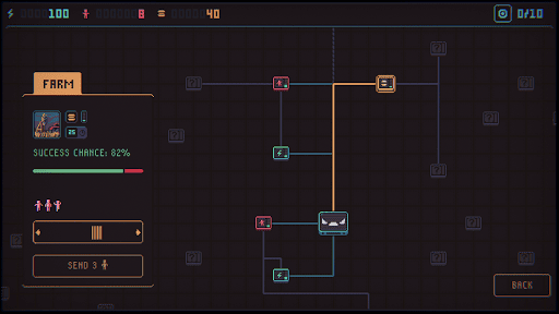 The resource management in this game is intense and unforgiving, so players must learn to be quick and ruthless to succeed. The rogue-lite nature of the game makes every playthrough unique due to the randomly generated events that occur. With every failure being fatal, players must start from scratch each time they play.