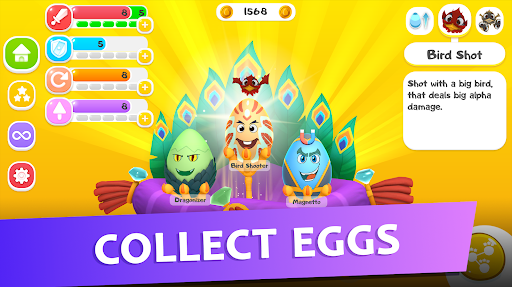 Break other eggs during battle, use various tactics, complete 60 levels, fight with tough bosses, upgrade your characters, get rewards.