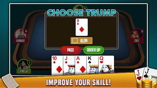 In Euchre Plus, you play just like in real life, choosing between accepting the trump, passing or changing your cards, playing the match with your partner or going alone. Play the proper cards and use the trumps wisely to win the tricks.
