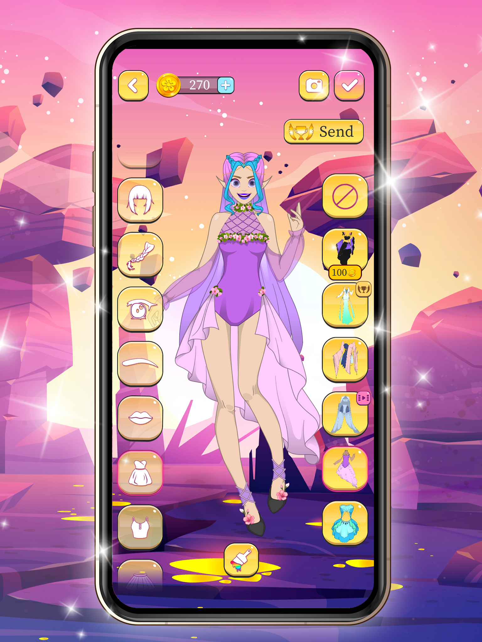 Variety of hairstyle try on for your anime doll in our app. Try all! Change hair color and enjoy! Design your own fantasy style!
