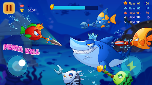 Fish War - Shark Battle IO is a free io game where you play as a deadly baby shark with a blade. Join a multiplayer arena of fish equipped with lovely yet fatal tusks and hunt down your share of prey while avoiding the sharp end of another player’s blade. Collect the fish head like trophies, eat sushi for boosts, and dominate the sea and become the king of the sea.