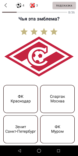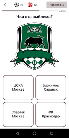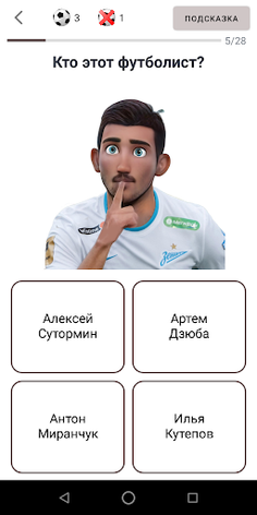 Это викторина про российский футбол, где нужно угадывать действующих футболистов, логотипы команд и стадионы.