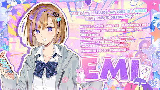 Emi is the Rebel Artist who defies societal norms and breaks free from the limitations of traditional schooling. Her privilege doesn't prevent her from paving her way and taking up street art by night. Her strong inner conflicts are more profound than those of her rival, Saki. You can help shape her unpredictable destiny or stick with your solid bond with bestie Saki!