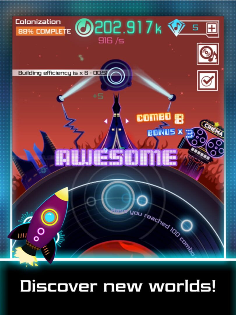 Embark on a thrilling journey to EXPLORE the vast and mesmerizing expanse of the Galaxy, and spread your unique and infectious GROOVE to every remote solar system. Set out on a mission to COLONIZE new planets by keeping up with the RHYTHM of your music and earn loads of music NOTES to construct state-of-the-art recording studios, metronomes, and microphones that will enhance your groove as you progress. Discover the mysteries that lie within the TEMPLE OF GROOVE and earn the title of the ultimate space groove master.