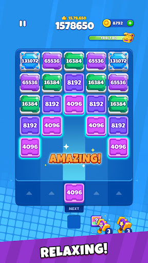 Drop and merge blocks of the same number together — 2 and 2 become 4, 4 and 4 become 8, then 32, 64, 128, 256, 512, 1024, 2048, 4096, 8192, 16384, and so on — to challenge higher number. It's easy to play, and while you're driven to do better in each round, it's not stressful or frustrating.