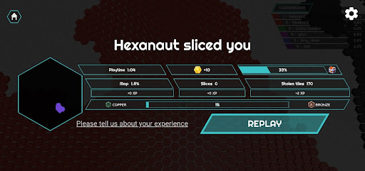 The ultimate goal is to conquer at least 20% of the map. 🥇 Maintain your domination for two whole minutes after achieving the Hexanaut status, and you'll come out victorious! If you get eliminated while another player is a Hexanaut, you won’t be able to join the game again. ⚠️