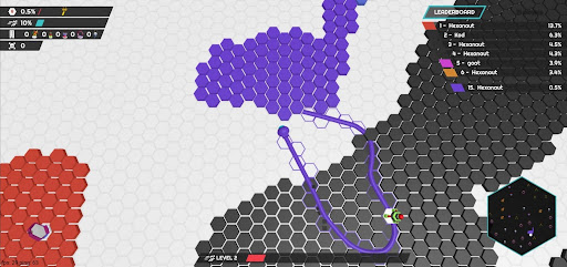 Dive into the thrilling world of Hexanaut.io where a combination of quick reflexes and strategic thinking is crucial. 🗺️ Conquer as much territory as possible without getting eliminated. Outsmart your opponents by avoiding your own line, and navigate the game map like a pro. 🏃♂️💨