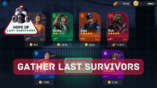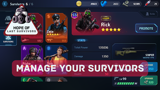 Realistic and appealing survivor designs portray characters from diverse backgrounds. Recruit talented individuals to help lead assaults and watch your team survive in the world!